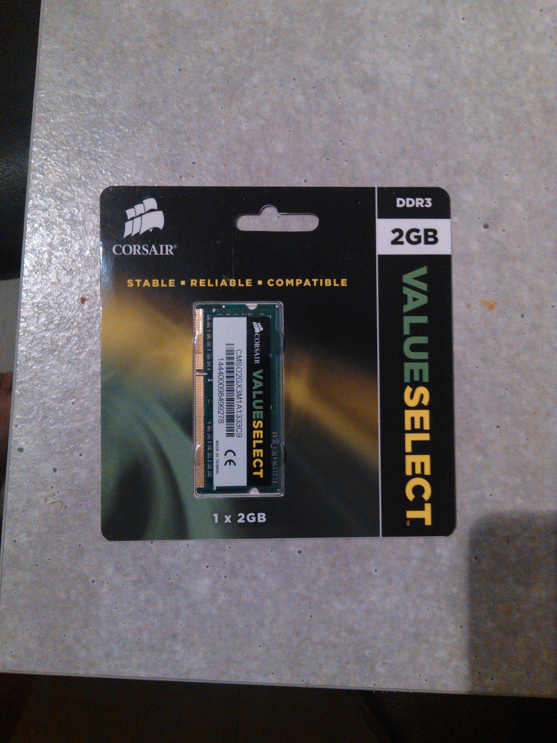 La Ram, Corsair 2 Go en DDR3. D’habitude je ne prends que de la Kingston pour sa garantie à vie, qui n’est pas une garantie à vie réelle j’en fais l’expérience il y a quelques temps déjà le service après vente est nickel, mais sur le site revendeur il n’avait que des packs à deux barrettes 8 et 16 Go, par pure flemme je l’avoue j’ai pris cette barrette. L’avenir me dira si j’avais raison.